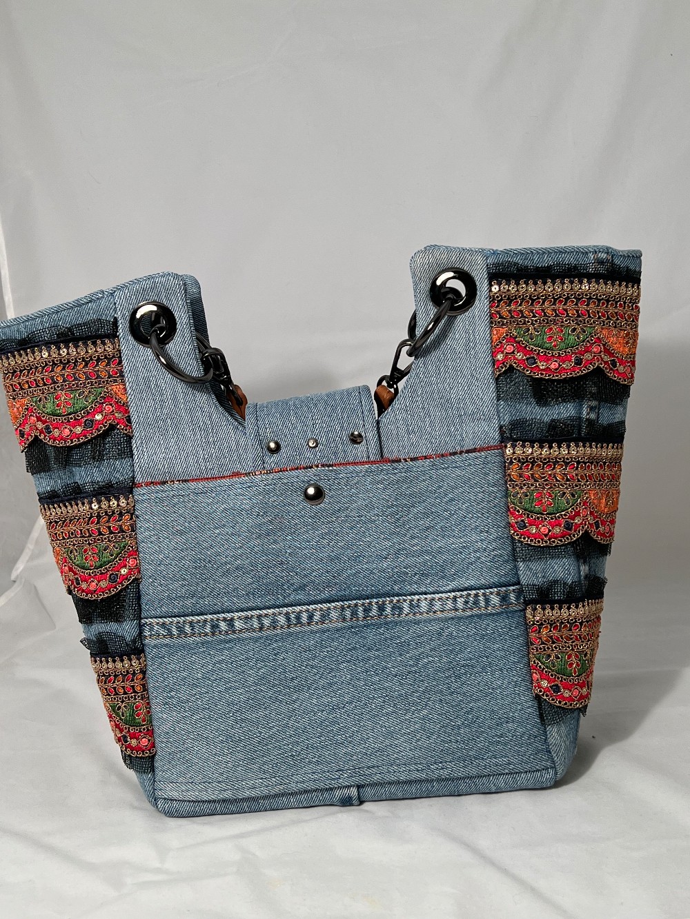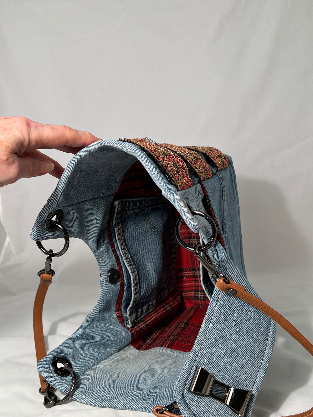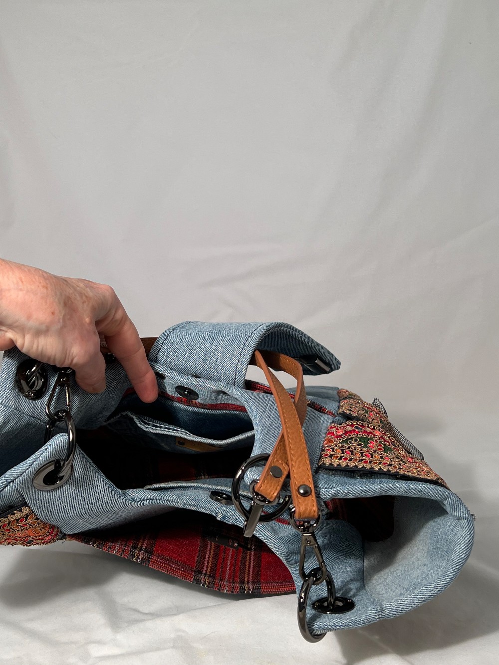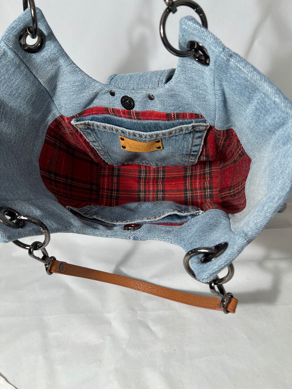 LuLu Jessie UP Gaelic and Tartan Faded Denim Market Bag with Double Camel leather handles.12 inches height. 15 inches at widest part. 4 inches deep across bottom. Outer pockets and interior are lined with tartan plaid. Gaelic ribbon trim embellishments. Black hardware, and lots of it. Black metallic bow closure.