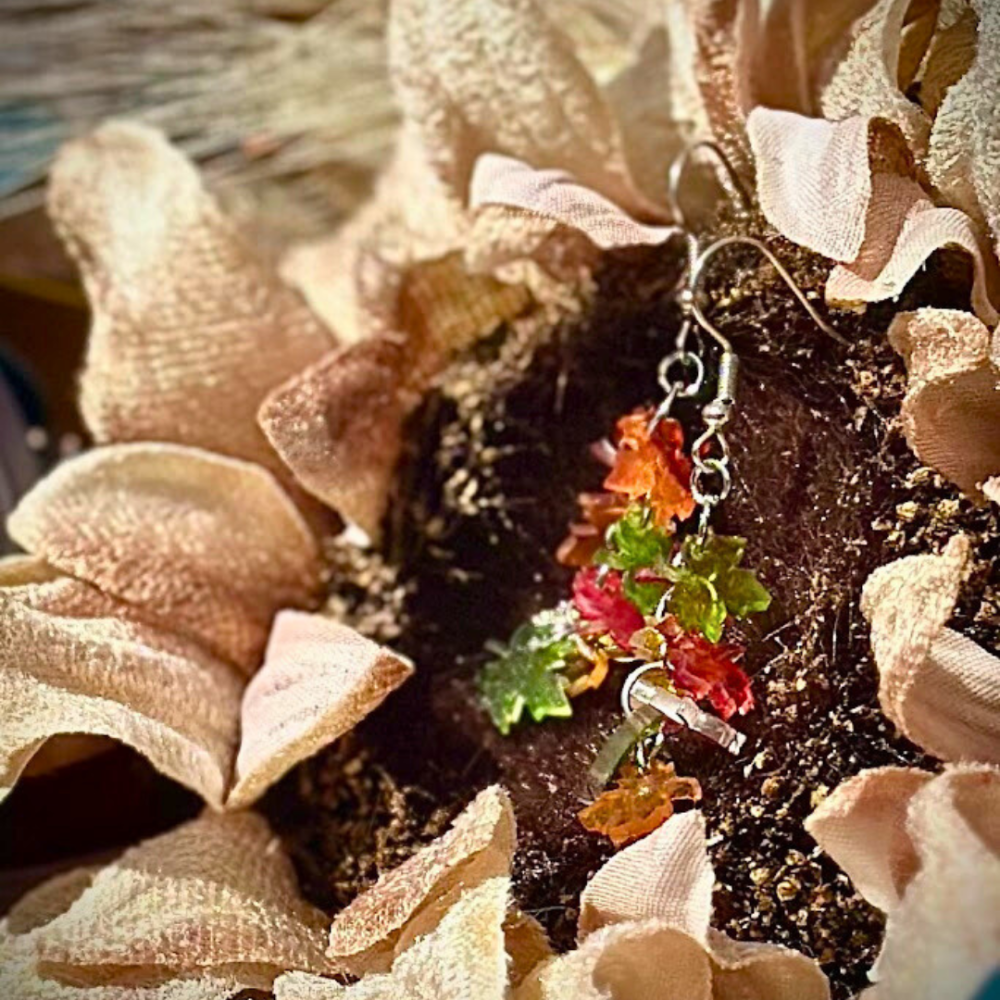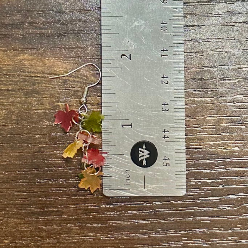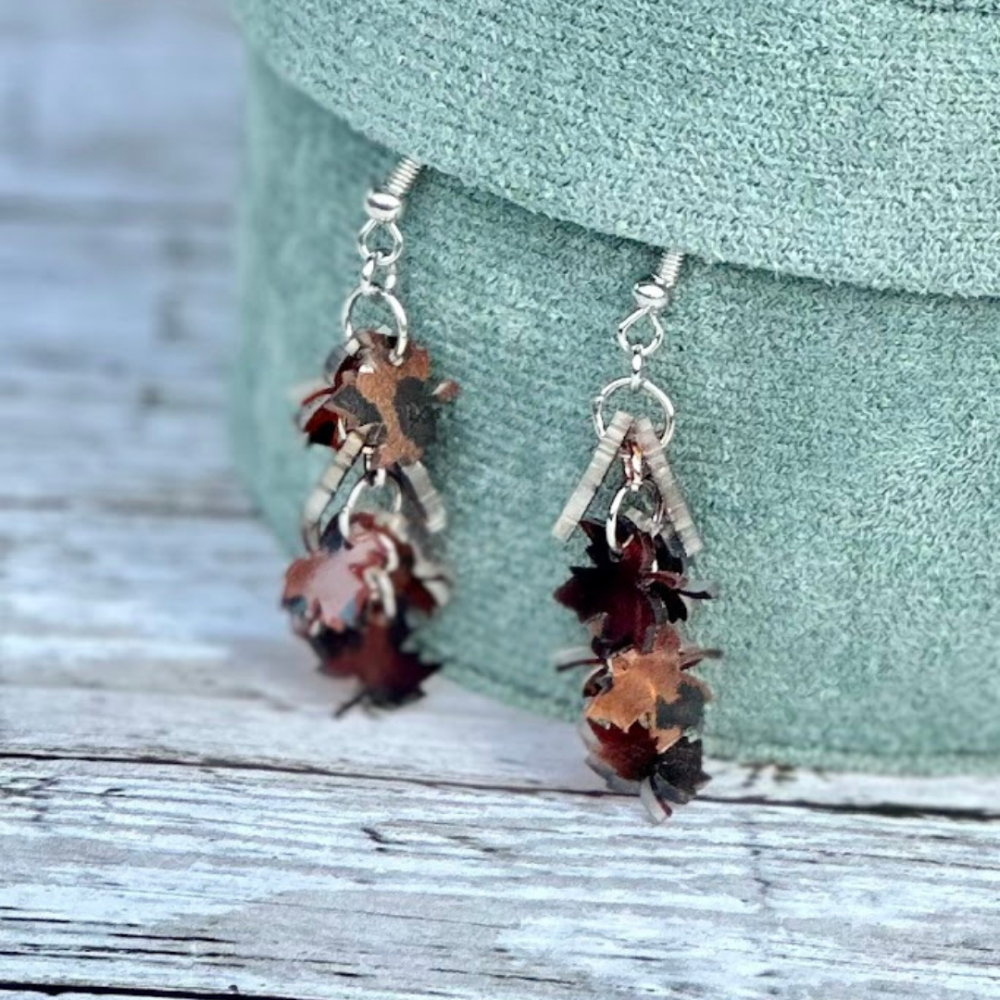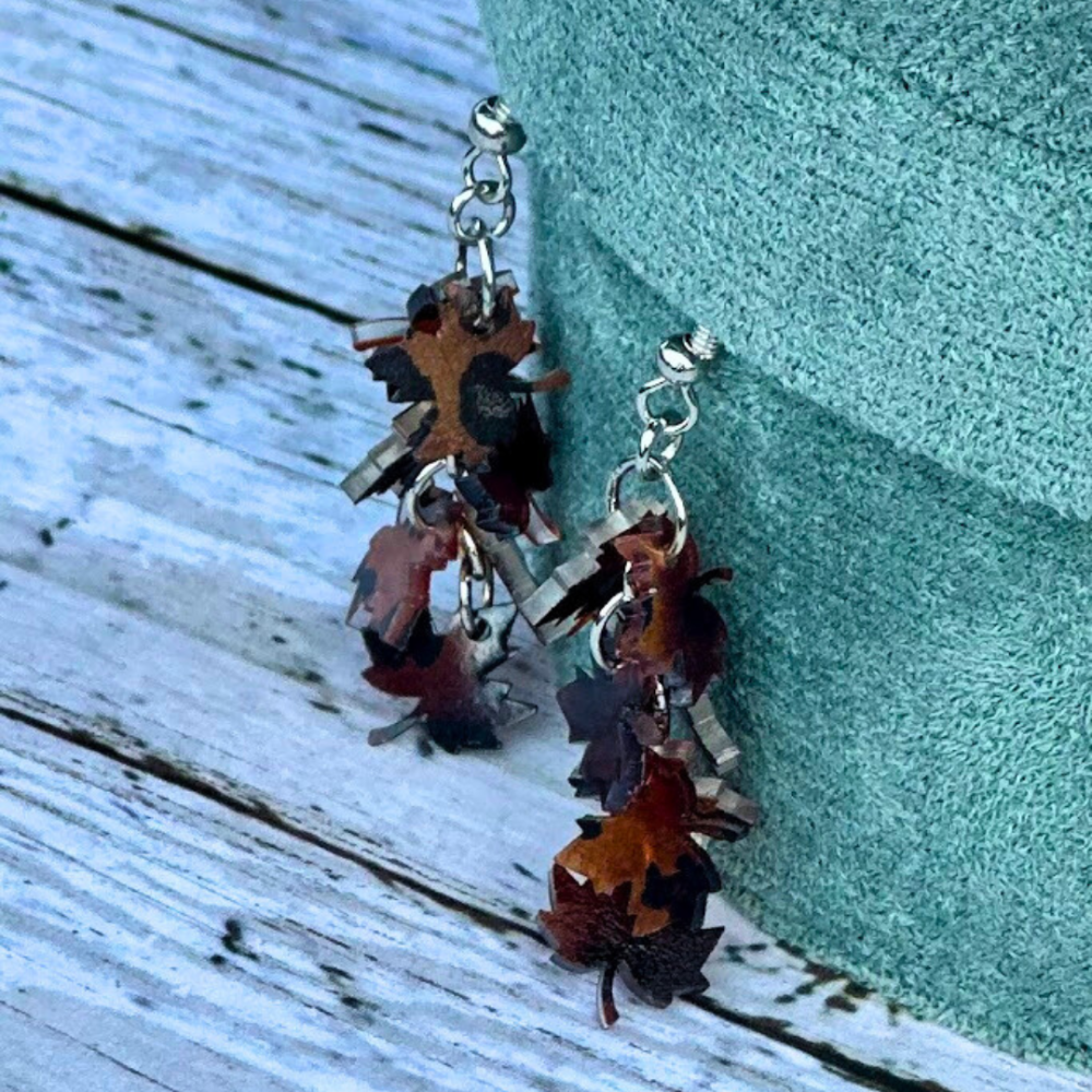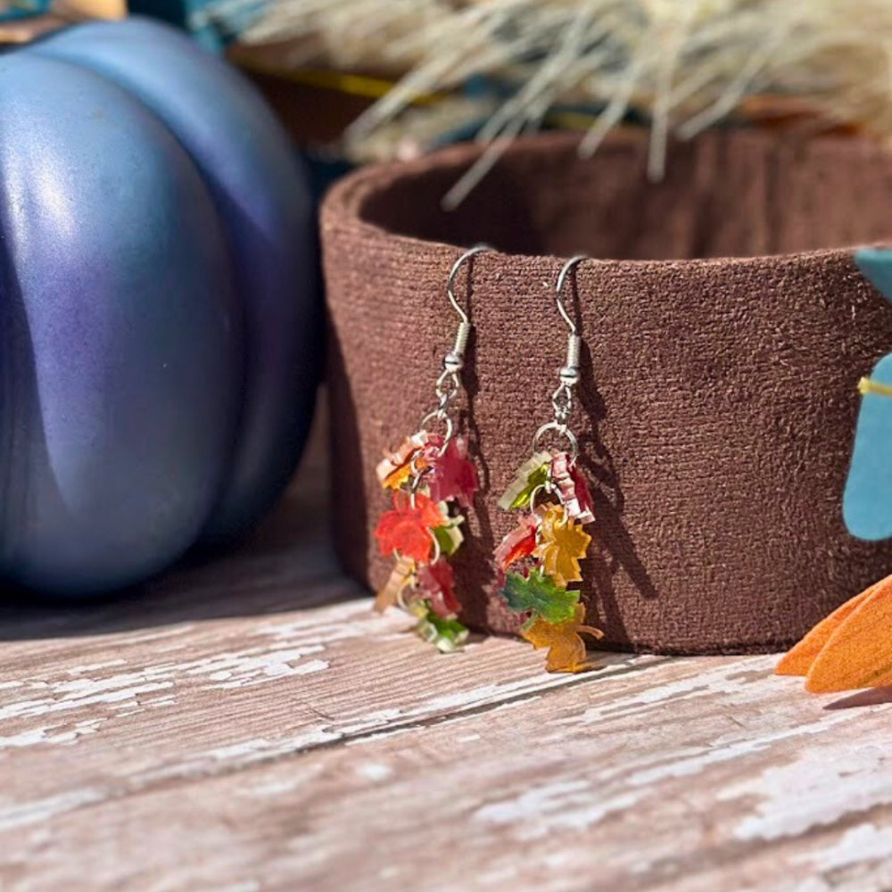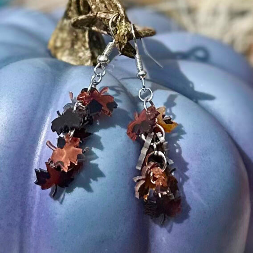 Maple leaf shaped dangle earrings. Available in fall colors or brown leopard.