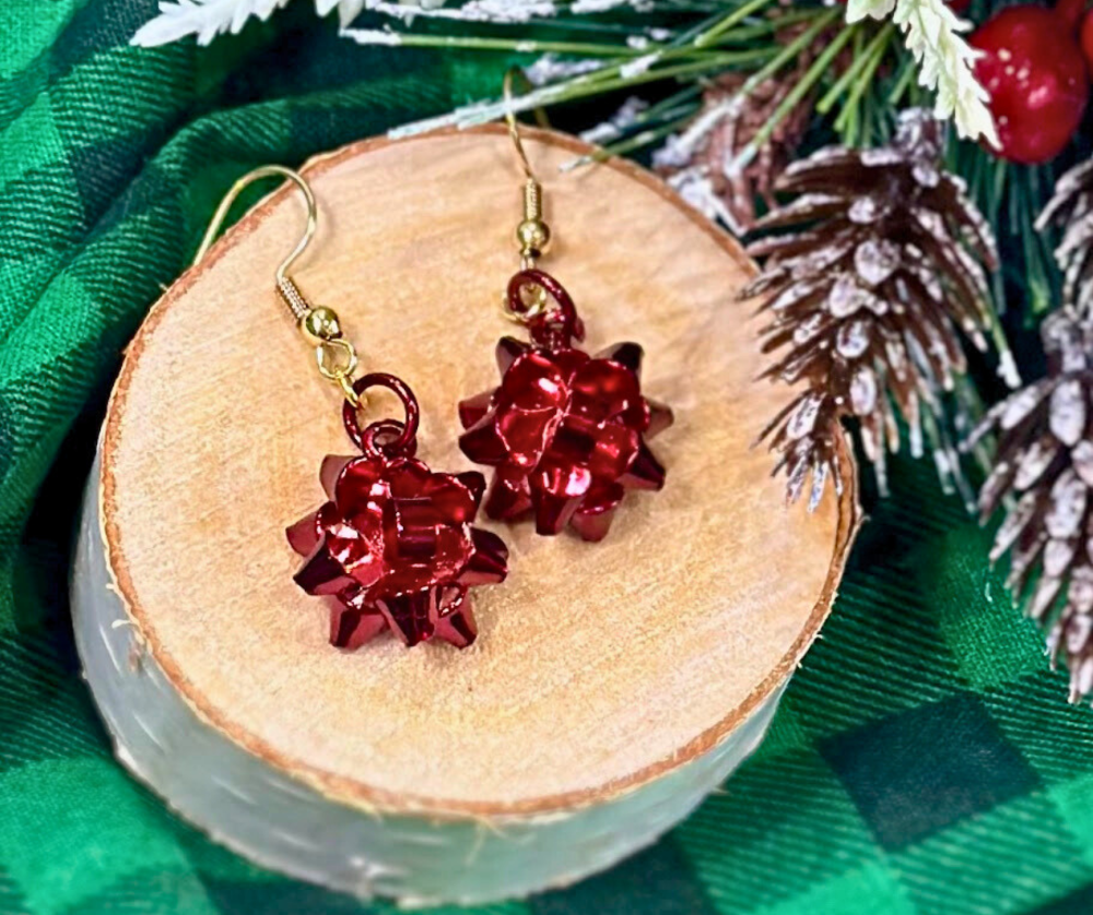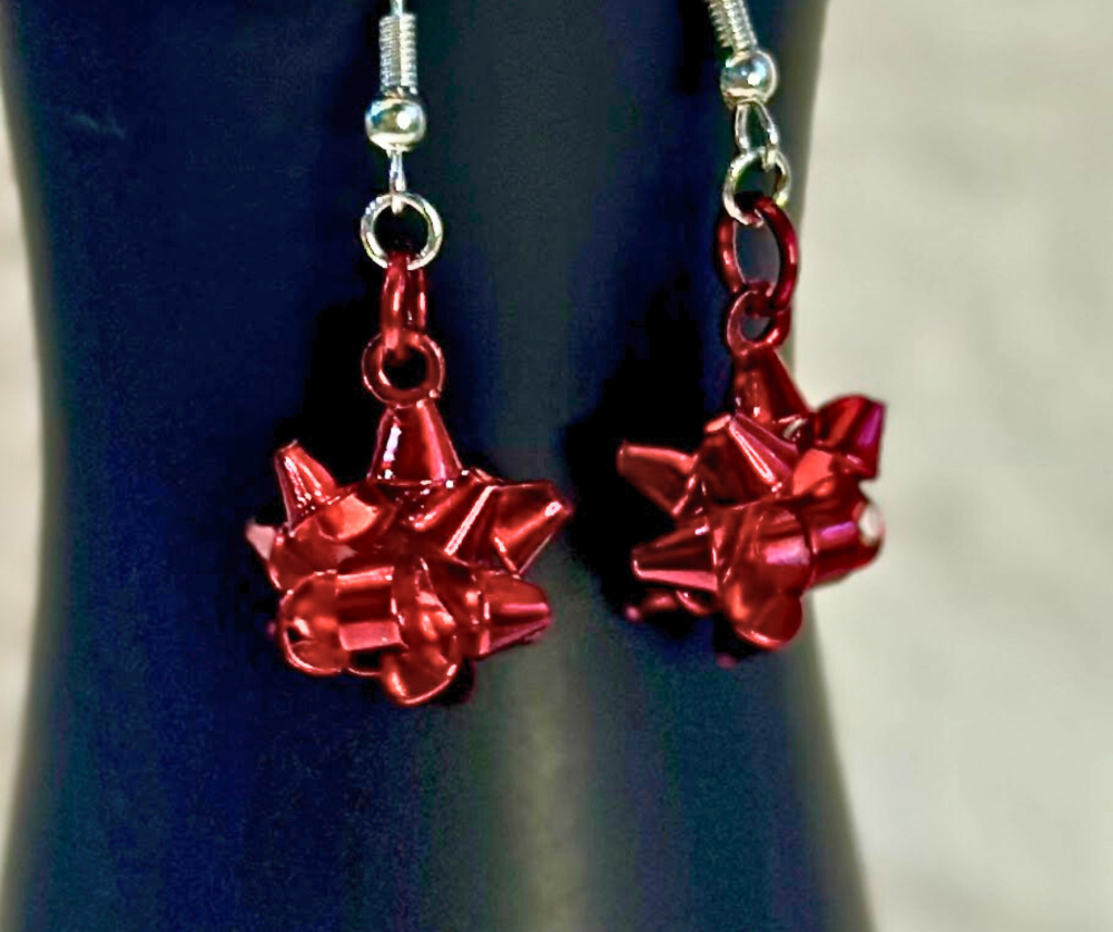 Red Metal Gift Bows, dangling from either silver or gold ear hooks.