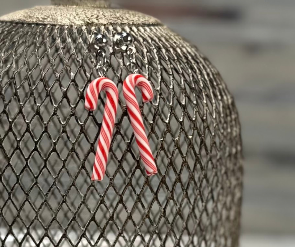 Clay Candy Cane on silver posts. Dangle length: Approx. 1.75in from piercing site.