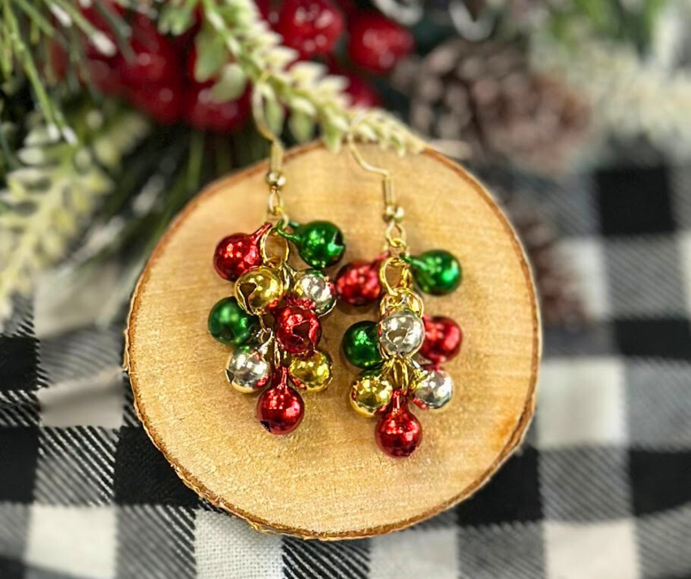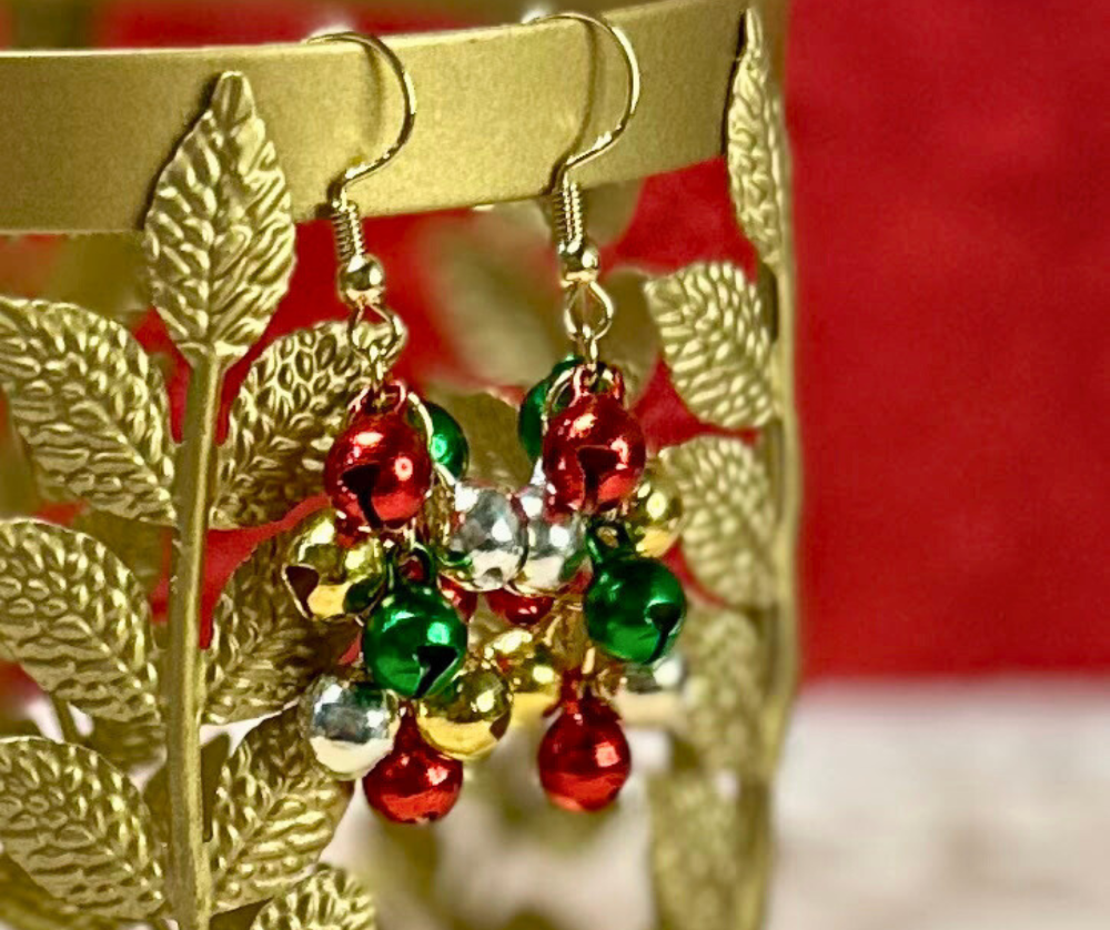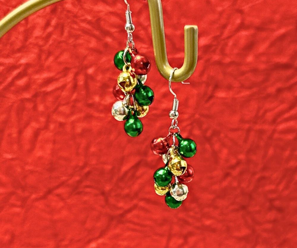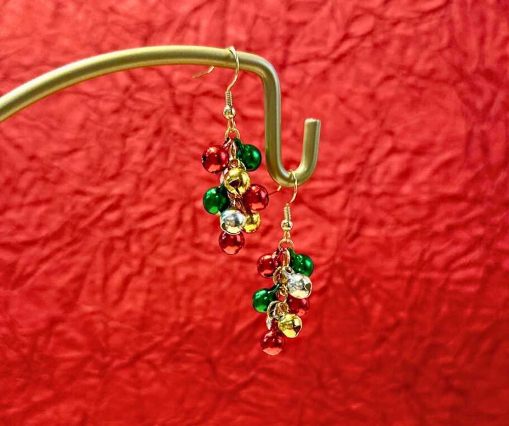 Design consists of red, green, silver, and gold bells on either silver or gold findings.