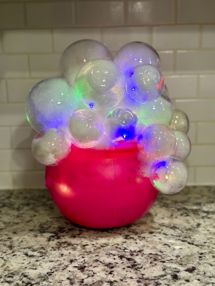 Plastic cauldron with light up plastic bubbles. 8 light settings