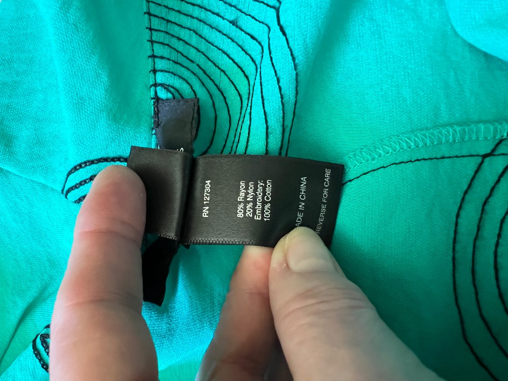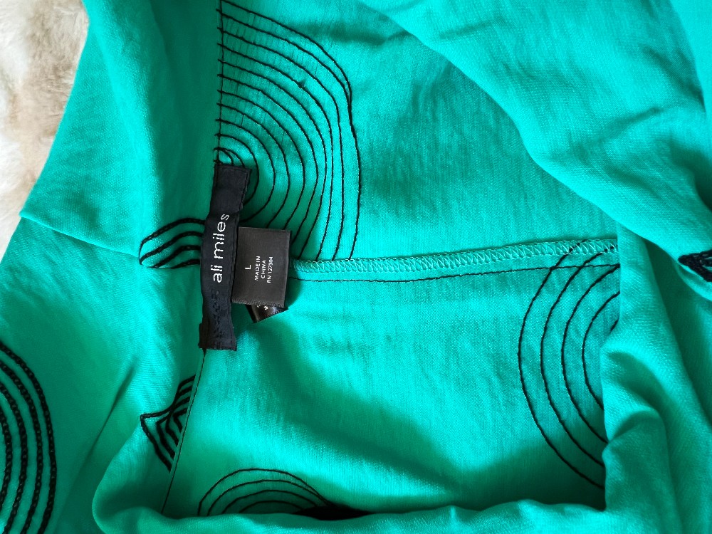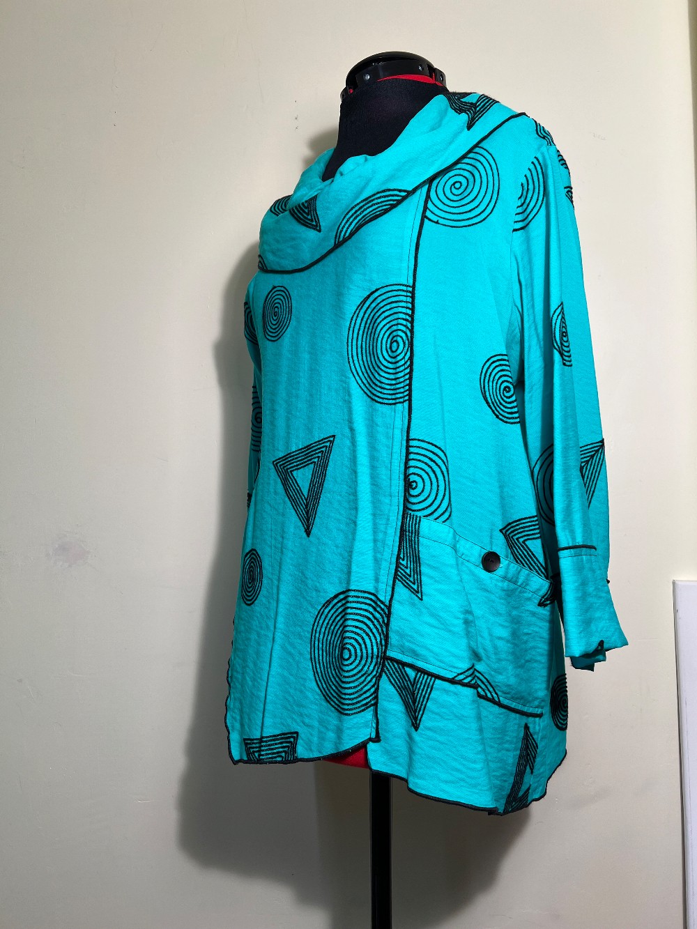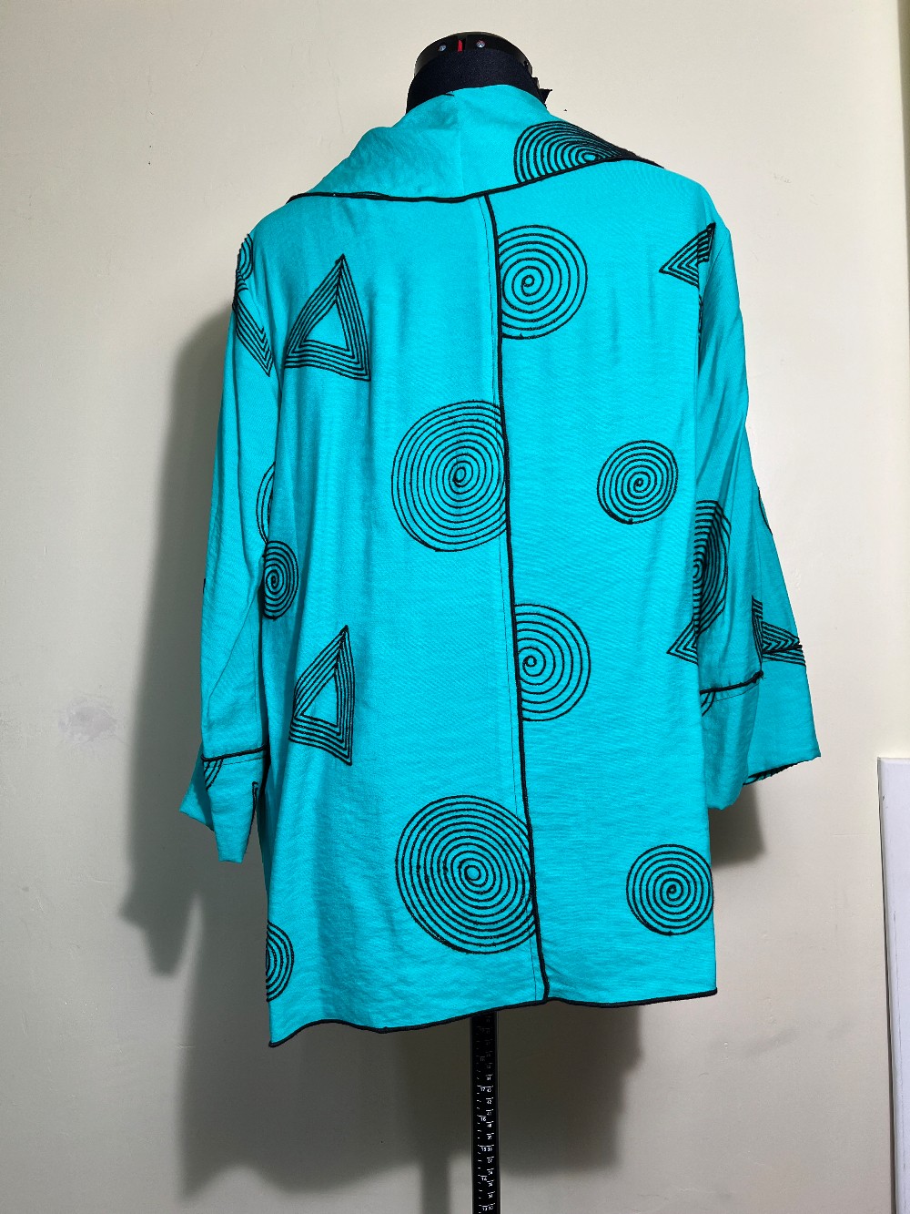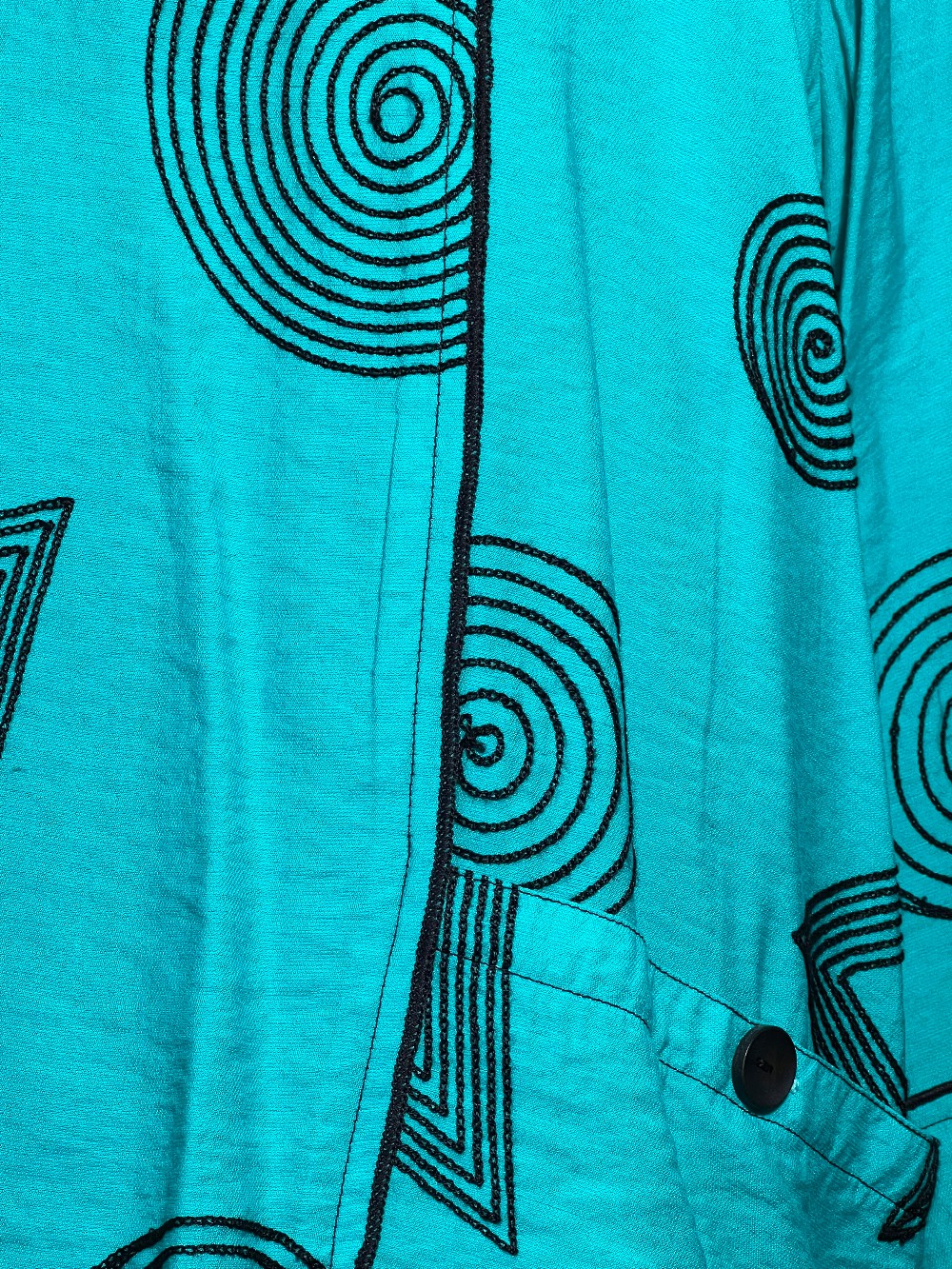 It is super comfortable perfect for the start of cooler temps. The fabric is a knit like a tee shirt. It keeps its shape beautifully. Embroidered geometric patterns in black stand out on the turquoise background. Go from the office out to dinner. 100% cotton.